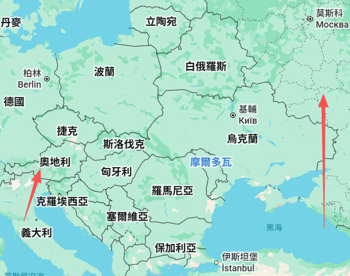 欧洲地图,左侧箭头指向奥地利,右侧箭头指向俄罗斯。