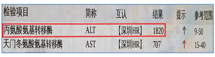 没思到情况越来越糟,症状最严重的刘先生去病院一查,发现肝功能显著颠倒,转氨酶ALT平直飙升到1820U/L!
