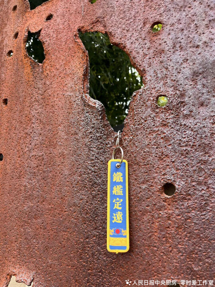 在定远舰残败制成的泊车场大门上,挂着一枚印着“铁舰定远”字样的钥匙扣。朱玥颖摄