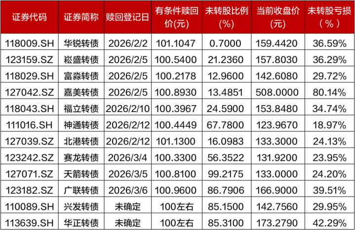 按照赎回登记日排序,这12家即将完成强赎的可转债分别是华锐转债、崧盛转债、富淼转债、嘉美转债、福立转债、神通转债、北港转债、赛龙转债、天箭转债、广联转债、兴发转债和华正转债,其中后两家转债还未确定赎回登记日。若投资者忘记卖出或转股而被按照债券面值加当期应计利息的价格强制赎回,按照2026年1月30日可转债的收盘价计算,这些转债持有者将分别面临18.97%—80.14%的投资损失。