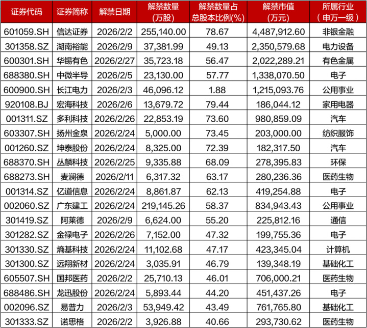 表2:2026年2月解禁市值超过100亿元或解禁占比超过40%的上市公司列表(左右滑动查看)