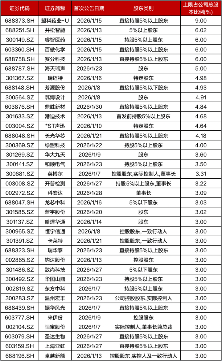 表3:2026年1月发布的公司股东拟减持计划(减持比例不低于3.00%)(左右滑动查看)