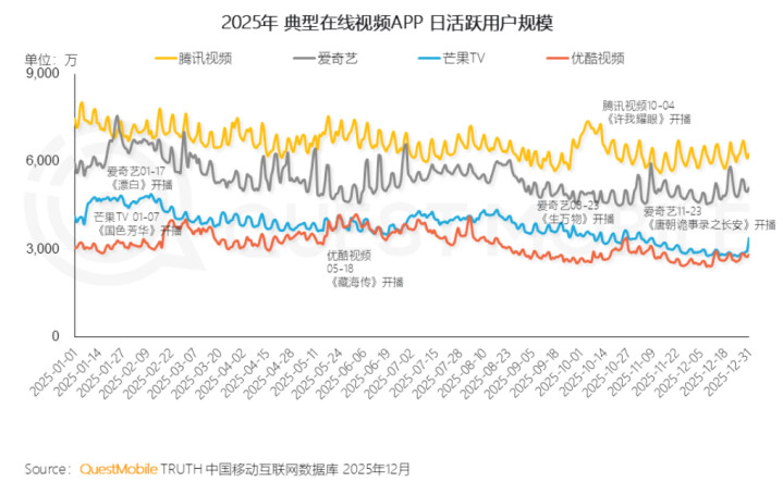 平台高级别剧集上线时,往往能拉动数据形成峰值。QuestMobile数据显示,纵观2025年全年各长视频平台的DAU(日活跃用户)变化,高点往往出现在独播热剧上线时,比如优酷的峰值来自2025年5月上线的《藏海传》,腾讯视频的峰值来自2025年10月上线的《许我耀眼》,爱奇艺的峰值来自2025年1月时《漂白》的热播,芒果TV的峰值来自2025年1月开播的《国色芳华》。