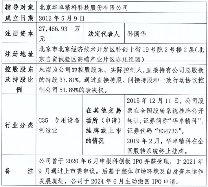 华卓精科于2015年12月在新三板挂牌,2019年2月晦止挂牌,曾于2020年6月申诉科创板IPO并获受理,2021年通过上市委审议,后基于合座阛阓环境及本身成本运作发展策划,在2024年6月主动除掉IPO肯求。