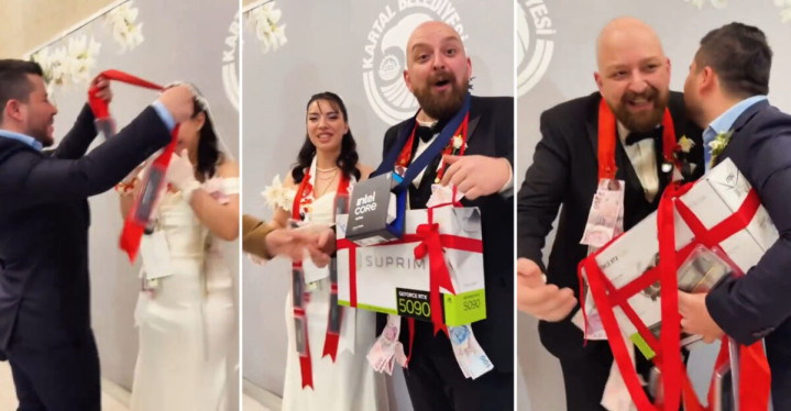 在这种硬件价钱暴涨的配景下,近日在外洋短视频平台上,一双土耳其新东说念主的别出机杼婚典巧合走红。在这场独到的婚典中,客东说念主们甩掉了传统的礼金来去习俗,转而罗致扶持电脑硬件部件,形式新颖又极具话题性。