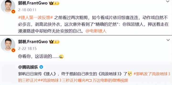 最近,就连和《镖东说念主》扯不上什么相干的郭帆都成了驻扎中心。