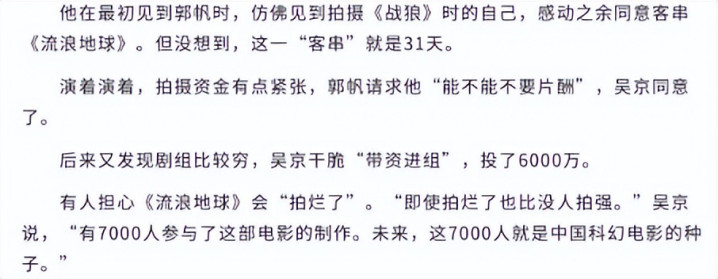 在资金困扰下,演完正片的吴京非但没拿到片酬,反而摇身一形成了剧组的“金主”。