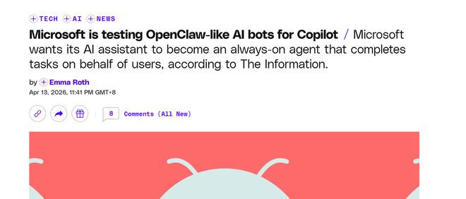[大众网科技空洞报说念]4月14日音问,据TheVerge报说念,微软公司证据,正研发一款类OpenClaw智能体家具,并主义将干系功能整合进Microsoft365Copilot,面向企业客户推出,以更完善的安全管控机制,助力企业办公智能化升级。