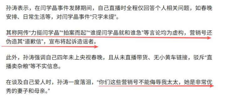 网上流传了许多“孙涛支持闫学晶”的言论。