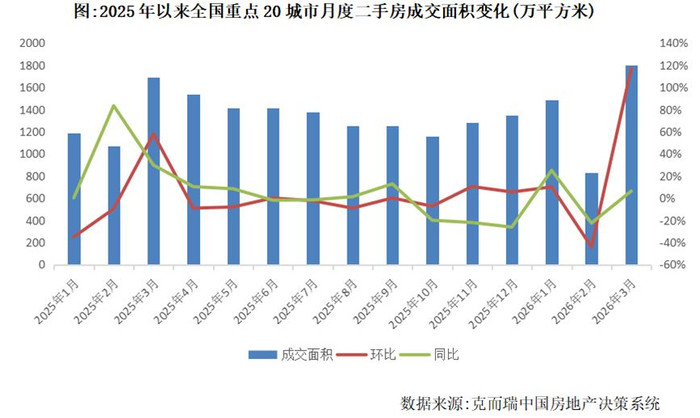 本年一季度,内地二手房产交往迎来小阳春。克而瑞讲述骄慢,3月要点20城二手房成交面积约1797万渊博米,环比增长117%,同比亦增长6%;一季度累计成交面积约4108万渊博米,同比增长4%。