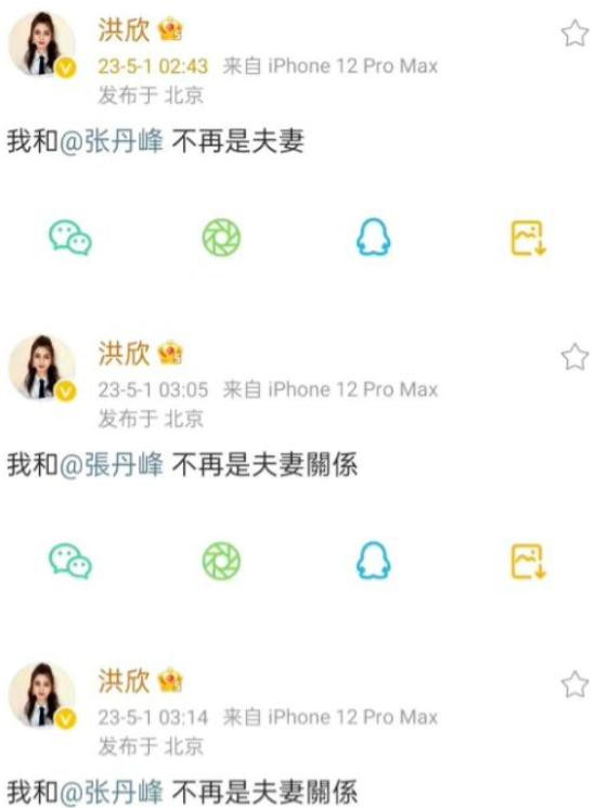 洪欣骤然连发三条动态,直言“我和张丹峰不再是配偶”,