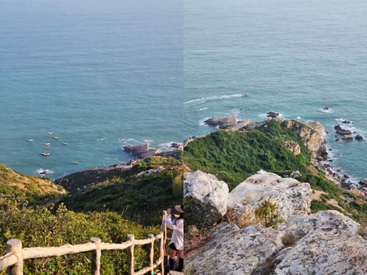 沿着栈说念往下走,全程齐是那种“之”字形的台阶,修在峭壁边上,一齐往下通向海边。台阶不少,从山顶走到海边大摘录20来分钟,但每下一段就能看到不一样的重生。