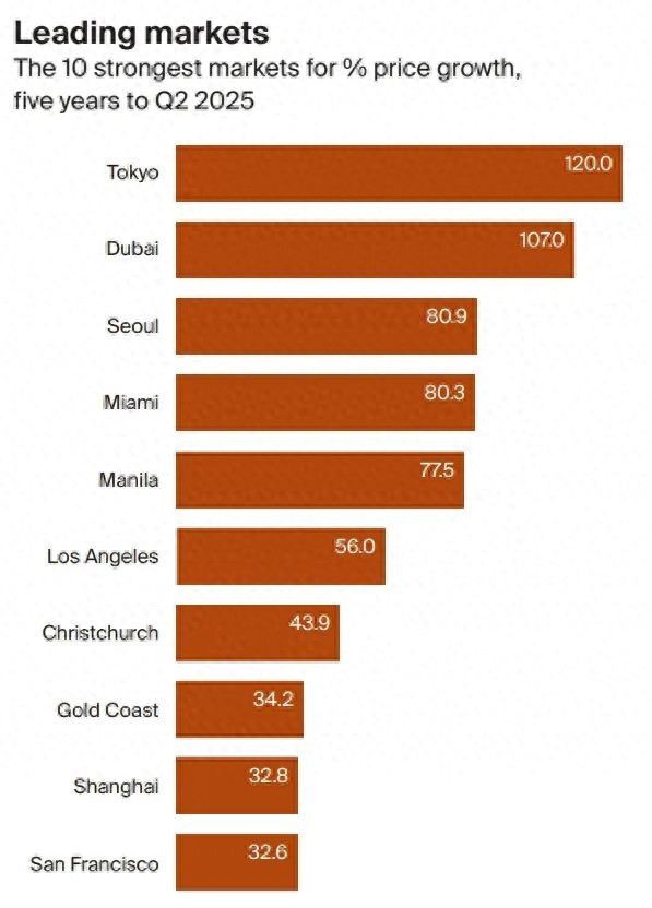 莱坊(Knight Frank)是大家顶级私营房地产参谋人服务机构,1896 年创立于英国伦敦。在莱坊《2025/26居住论说》的最新统计中,往时五年至2025年第二季度,大家多个城市高端住宅市集的涨幅创下历史新高。