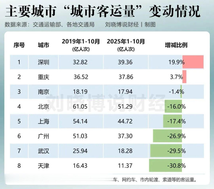下图是8大城市本年1到10月的“城市客运量”跟2019年同时的比拟,深圳是独一大幅增长的主要城市。