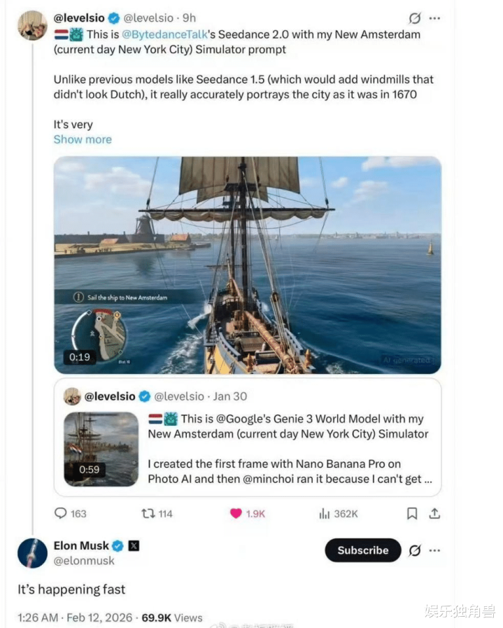 “It's happening fast(发展速率太快)”2月12日,马斯克在酬酢平台发出这么的感叹,他说的恰是字节越过视频模子Seedance 2.0。