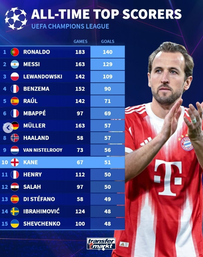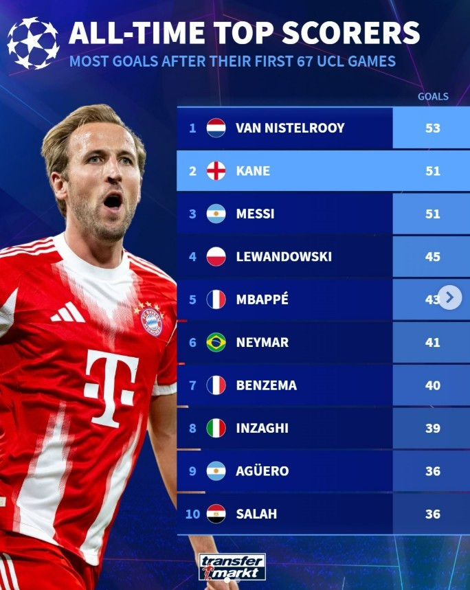 澳洲幸运5app 凯恩生计67场欧冠进51球, 换取场次进球数仅次于范尼, 与梅西换取