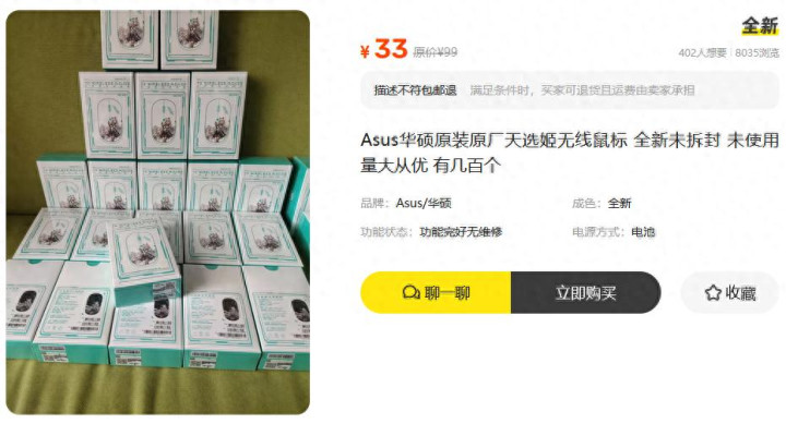 华硕天选姬这个二次元IP这几年在数码圈里照实混得申明鹊起,从札记本到外设全家桶,收割了不少年青东说念主的好感。可谁能思到,官方原厂的天选无线鼠标,当今在二手鱼里尽然只有33元,还全新未拆封,卖家说有几百个,量大从优。
