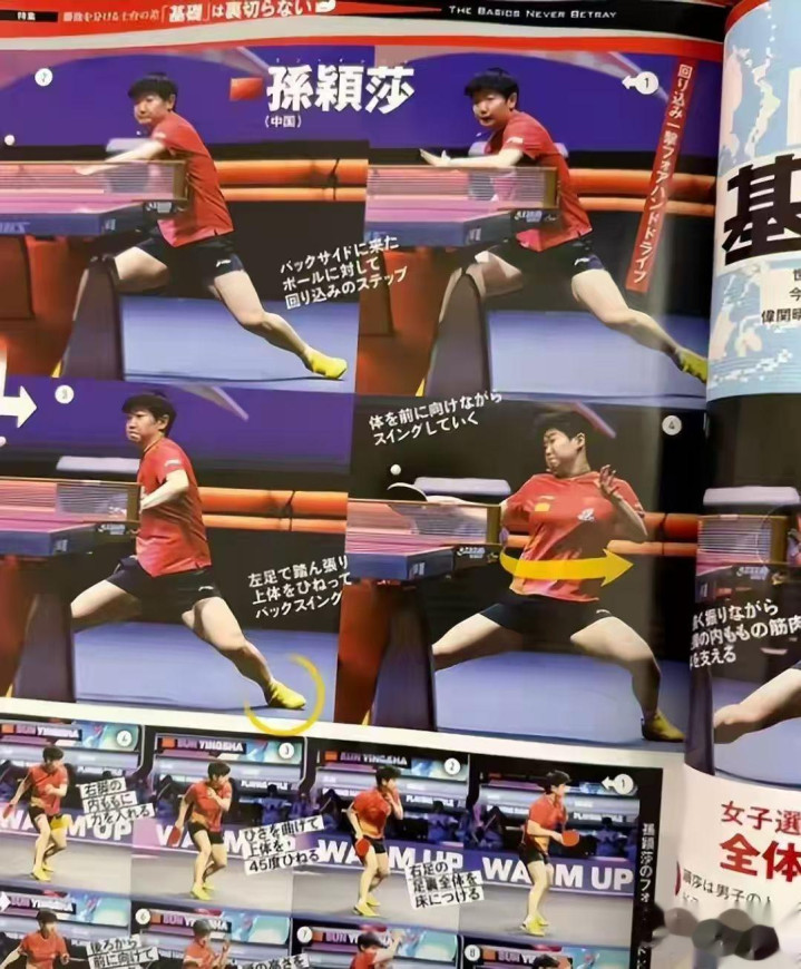 日本泰斗乒乓杂志《卓球王国》,创刊50多年来,初度采取异邦选手动作封面,还专门用大篇幅内容,逐帧拆解孙颖莎的发球、接球技艺,把她当成乒乓球教科书来商榷。