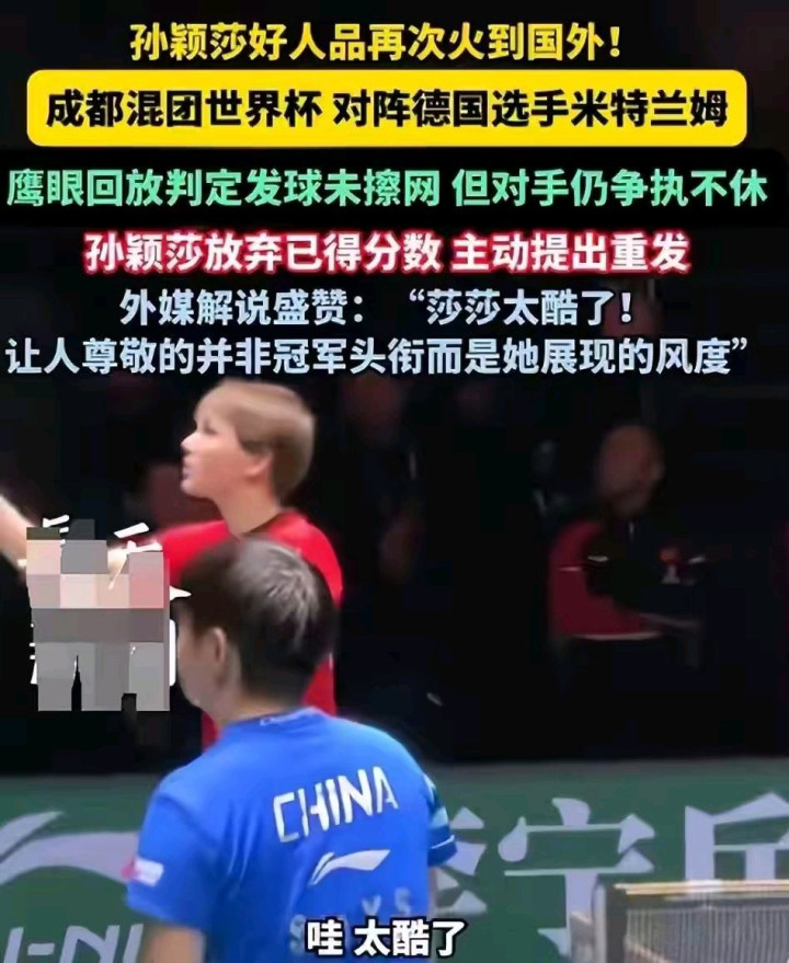 换作念其他选手,粗略率会相持判罚,守住这一分,可孙颖莎莫得纠结输赢,主动知道裁判,烧毁这一分,重新发球。